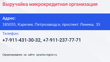 Выручайка, микрокредитная организация по адресу 185035, Карелия, Петрозаводск, проспект Ленина, 35 в дальнейшем Организация, размещена в следующих категориях:
