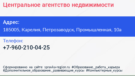 Центральное агентство недвижимости по адресу 185005, Карелия, Петрозаводск, Промышленная, 10а в дальнейшем Организация, размещена в следующих категориях: