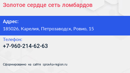 Золотое сердце, сеть ломбардов по адресу 185026, Карелия, Петрозаводск, Ровио, 15 в дальнейшем Организация, размещена в следующих категориях: