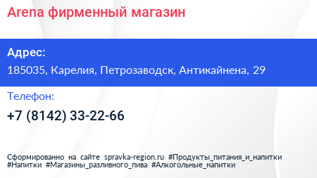 Arena, фирменный магазин по адресу 185035, Карелия, Петрозаводск, Антикайнена, 29 в дальнейшем Организация, размещена в следующих категориях: