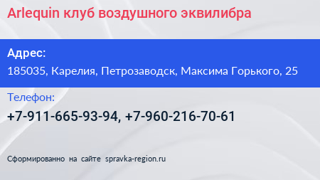 Arlequin, клуб воздушного эквилибра по адресу 185035, Карелия, Петрозаводск, Максима Горького, 25 в дальнейшем Организация, размещена в следующих категориях: