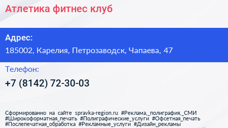 Атлетика, фитнес-клуб по адресу 185002, Карелия, Петрозаводск, Чапаева, 47 в дальнейшем Организация, размещена в следующих категориях:
