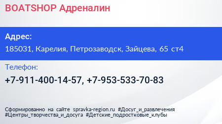 BOATSHOP Адреналин по адресу 185031, Карелия, Петрозаводск, Зайцева, 65 ст4 в дальнейшем Организация, размещена в следующих категориях: