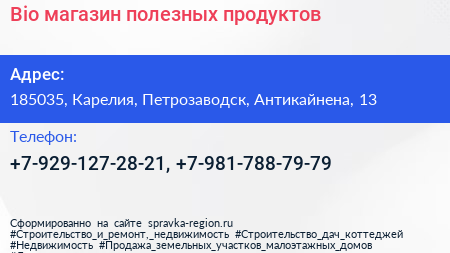 Bio, магазин полезных продуктов по адресу 185035, Карелия, Петрозаводск, Антикайнена, 13 в дальнейшем Организация, размещена в следующих категориях: