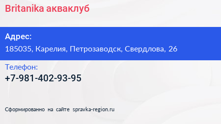 Britanika, акваклуб по адресу 185035, Карелия, Петрозаводск, Свердлова, 26 в дальнейшем Организация, размещена в следующих категориях: