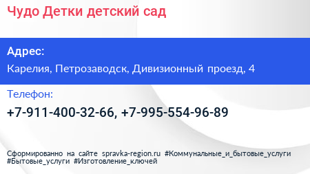 Чудо Детки, детский сад по адресу Карелия, Петрозаводск, Дивизионный проезд, 4 в дальнейшем Организация, размещена в следующих категориях: