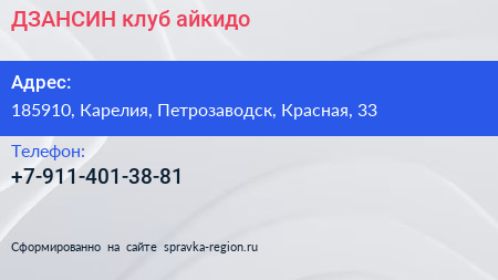 ДЗАНСИН, клуб айкидо по адресу 185910, Карелия, Петрозаводск, Красная, 33 в дальнейшем Организация, размещена в следующих категориях: