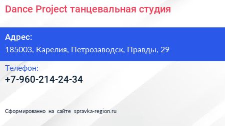 Dance Project, танцевальная студия по адресу 185003, Карелия, Петрозаводск, Правды, 29 в дальнейшем Организация, размещена в следующих категориях: