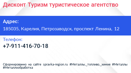 Дисконт-Туризм, туристическое агентство по адресу 185035, Карелия, Петрозаводск, проспект Ленина, 12 в дальнейшем Организация, размещена в следующих категориях: