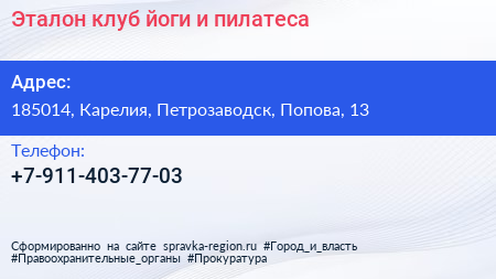Эталон, клуб йоги и пилатеса по адресу 185014, Карелия, Петрозаводск, Попова, 13 в дальнейшем Организация, размещена в следующих категориях: