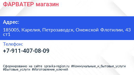 ФАРВАТЕР, магазин по адресу 185005, Карелия, Петрозаводск, Онежской Флотилии, 43 ст1 в дальнейшем Организация, размещена в следующих категориях: