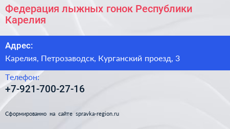 Федерация лыжных гонок Республики Карелия по адресу Карелия, Петрозаводск, Курганский проезд, 3 в дальнейшем Организация, размещена в следующих категориях: