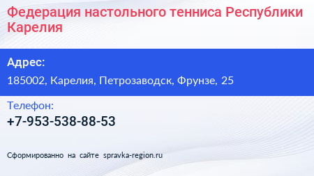 Федерация настольного тенниса Республики Карелия по адресу 185002, Карелия, Петрозаводск, Фрунзе, 25 в дальнейшем Организация, размещена в следующих категориях: