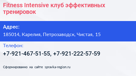 Fitness Intensive, клуб эффективных тренировок по адресу 185014, Карелия, Петрозаводск, Чистая, 15 в дальнейшем Организация, размещена в следующих категориях: