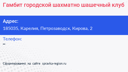 Гамбит, городской шахматно-шашечный клуб по адресу 185035, Карелия, Петрозаводск, Кирова, 2 в дальнейшем Организация, размещена в следующих категориях:
