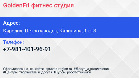 GoldenFit, фитнес-студия по адресу Карелия, Петрозаводск, Калинина, 1 ст8 в дальнейшем Организация, размещена в следующих категориях: