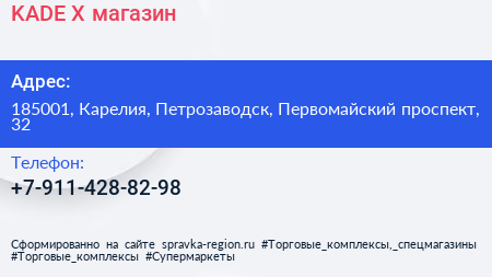 KADE`X, магазин по адресу 185001, Карелия, Петрозаводск, Первомайский проспект, 32 в дальнейшем Организация, размещена в следующих категориях:
