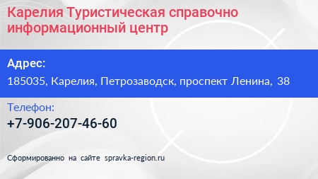 Карелия Туристическая, справочно-информационный центр по адресу 185035, Карелия, Петрозаводск, проспект Ленина, 38 в дальнейшем Организация, размещена в следующих категориях:
