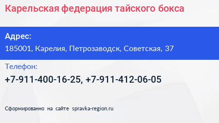 Карельская федерация тайского бокса по адресу 185001, Карелия, Петрозаводск, Советская, 37 в дальнейшем Организация, размещена в следующих категориях: