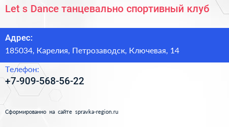 Let`s Dance, танцевально-спортивный клуб по адресу 185034, Карелия, Петрозаводск, Ключевая, 14 в дальнейшем Организация, размещена в следующих категориях:
