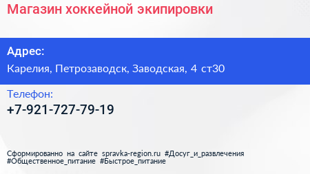 Магазин хоккейной экипировки по адресу Карелия, Петрозаводск, Заводская, 4 ст30 в дальнейшем Организация, размещена в следующих категориях: