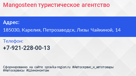 Mangosteen, туристическое агентство по адресу 185030, Карелия, Петрозаводск, Лизы Чайкиной, 14 в дальнейшем Организация, размещена в следующих категориях: