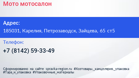 Мото, мотосалон по адресу 185031, Карелия, Петрозаводск, Зайцева, 65 ст5 в дальнейшем Организация, размещена в следующих категориях: