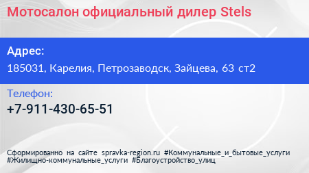 Мотосалон, официальный дилер Stels по адресу 185031, Карелия, Петрозаводск, Зайцева, 63 ст2 в дальнейшем Организация, размещена в следующих категориях: