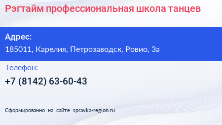Рэгтайм, профессиональная школа танцев по адресу 185011, Карелия, Петрозаводск, Ровио, 3а в дальнейшем Организация, размещена в следующих категориях: