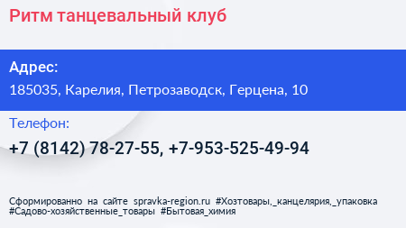 Ритм, танцевальный клуб по адресу 185035, Карелия, Петрозаводск, Герцена, 10 в дальнейшем Организация, размещена в следующих категориях: