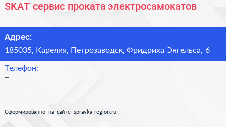 SKAT, сервис проката электросамокатов по адресу 185035, Карелия, Петрозаводск, Фридриха Энгельса, 6 в дальнейшем Организация, размещена в следующих категориях: