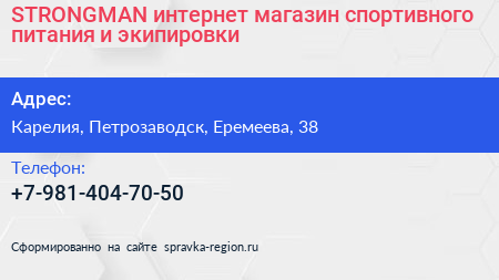 STRONGMAN, интернет-магазин спортивного питания и экипировки по адресу Карелия, Петрозаводск, Еремеева, 38 в дальнейшем Организация, размещена в следующих категориях: