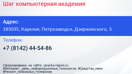 Шаг, компьютерная академия по адресу 185035, Карелия, Петрозаводск, Дзержинского, 5 в дальнейшем Организация, размещена в следующих категориях: