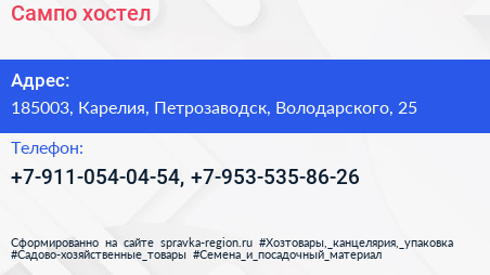 Сампо, хостел по адресу 185003, Карелия, Петрозаводск, Володарского, 25 в дальнейшем Организация, размещена в следующих категориях: