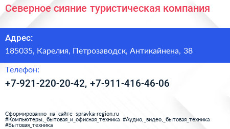 Северное сияние, туристическая компания по адресу 185035, Карелия, Петрозаводск, Антикайнена, 38 в дальнейшем Организация, размещена в следующих категориях:
