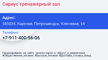 Сириус, тренажерный зал по адресу 185034, Карелия, Петрозаводск, Ключевая, 14 в дальнейшем Организация, размещена в следующих категориях: