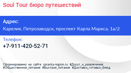 Soul Tour, бюро путешествий по адресу Карелия, Петрозаводск, проспект Карла Маркса, 1а/2 в дальнейшем Организация, размещена в следующих категориях: