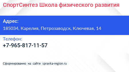 СпортСинтез, Школа физического развития по адресу 185034, Карелия, Петрозаводск, Ключевая, 14 в дальнейшем Организация, размещена в следующих категориях: