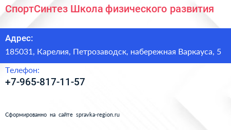 СпортСинтез, Школа физического развития по адресу 185031, Карелия, Петрозаводск, набережная Варкауса, 5 в дальнейшем Организация, размещена в следующих категориях: