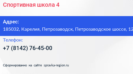 Спортивная школа №4 по адресу 185032, Карелия, Петрозаводск, Петрозаводское шоссе, 12 в дальнейшем Организация, размещена в следующих категориях: