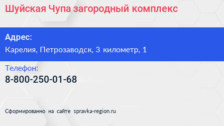 Шуйская Чупа, загородный комплекс по адресу Карелия, Петрозаводск, 3 километр, 1 в дальнейшем Организация, размещена в следующих категориях: