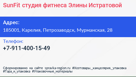SunFit, студия фитнеса Элины Истратовой по адресу 185001, Карелия, Петрозаводск, Мурманская, 28 в дальнейшем Организация, размещена в следующих категориях: