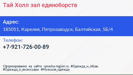 Тай-Холл, зал единоборств по адресу 185011, Карелия, Петрозаводск, Балтийская, 5Б/4 в дальнейшем Организация, размещена в следующих категориях:
