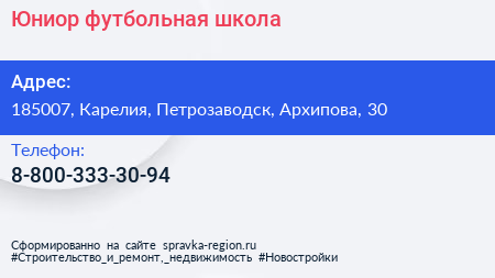 Юниор, футбольная школа по адресу 185007, Карелия, Петрозаводск, Архипова, 30 в дальнейшем Организация, размещена в следующих категориях: