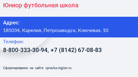 Юниор, футбольная школа по адресу 185034, Карелия, Петрозаводск, Ключевая, 10 в дальнейшем Организация, размещена в следующих категориях: