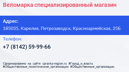 Веломарка, специализированный магазин по адресу 185035, Карелия, Петрозаводск, Красноармейская, 25Б в дальнейшем Организация, размещена в следующих категориях:
