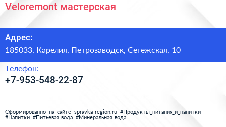 Veloremont, мастерская по адресу 185033, Карелия, Петрозаводск, Сегежская, 10 в дальнейшем Организация, размещена в следующих категориях: