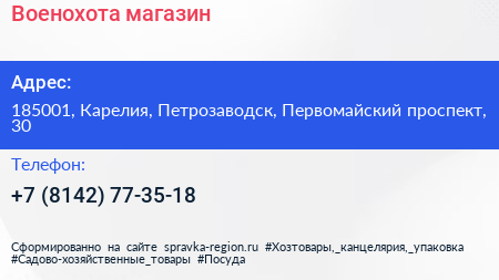 Военохота, магазин по адресу 185001, Карелия, Петрозаводск, Первомайский проспект, 30 в дальнейшем Организация, размещена в следующих категориях: