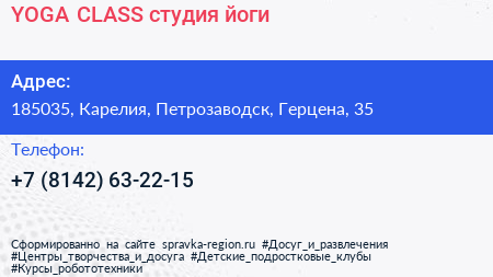 YOGA CLASS, студия йоги по адресу 185035, Карелия, Петрозаводск, Герцена, 35 в дальнейшем Организация, размещена в следующих категориях: