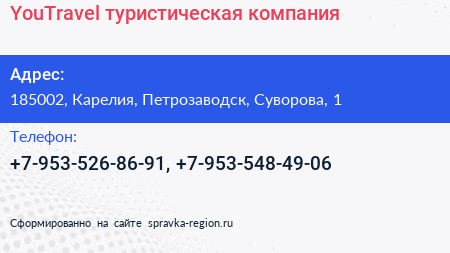 YouTravel, туристическая компания по адресу 185002, Карелия, Петрозаводск, Суворова, 1 в дальнейшем Организация, размещена в следующих категориях: